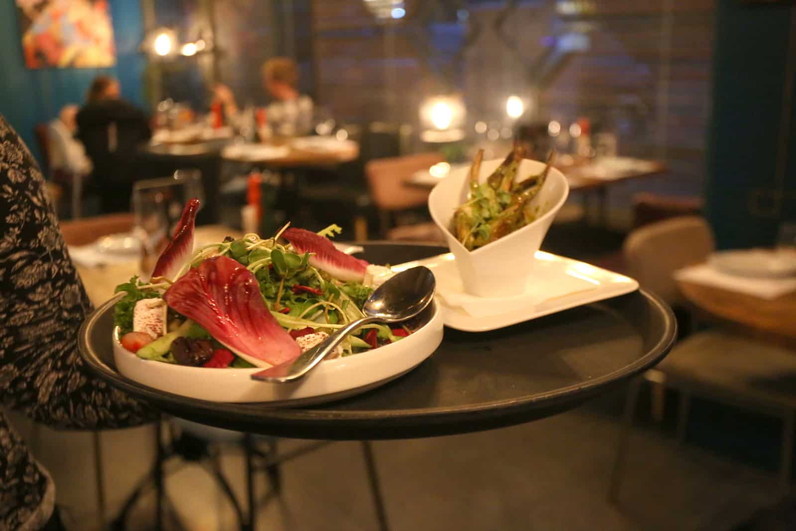 ניסינו גם את 'סלט סנגריה' –מנת פתיחה נפלאה שכוללת שני סוגי חסה, פרוסות תותים, גבינת פטה כבשים, מלפפון תאילנדי וצלפים. מנת פתיחה לא פחות מיוחדת היא ארטישוק ספרדי צרוב שמונח על קרם עגבניות ונגיעות פסטו. המסעדה מתמחה גם בפירות ים כמו מולים, קלמארי ותמנון על הפלנצ'ה בסלסת עגבניות שרי וצלפים